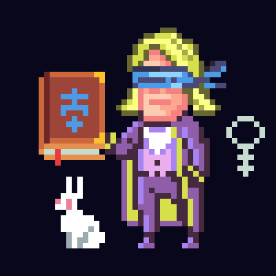 A male radiant figure draped in robes of violet and gold, their presence exuding calm authority and quiet mystery. A silken blue band is tied firmly across their eyes not in blindness, but as a seal upon sight too vast for mortal minds. In one hand, they hold an ancient tome inscribed with runes of divine symmetry, its pages said to rewrite themselves according to the reader’s fate. A soft aura hums around them, pulsing with the rhythm of unseen stars. Beside them sits a snow-white hare, eyes reflecting the light of distant moons a familiar that sees what its master must not. Though sightless, the seer perceives everything: the tremor of time, the shape of destiny, and the quiet truth behind all lies. To meet their gaze even through the veil is to glimpse yourself as the gods do. --p ijh3e4b