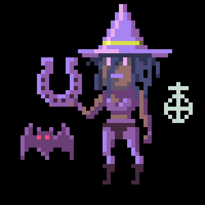 A confident witch with deep-toned skin and flowing indigo hair cascading from beneath a tall lavender hat banded in soft gold; she wears a fitted outfit of violet hues cropped top, high boots, and sleek trousers all gleaming faintly under the ambient glow of her magic; in one hand she holds a luminous horseshoe-shaped charm of enchanted amethyst metal, pulsing with energy; by her side flutters a small violet bat with glowing crimson eyes, its wings cutting delicate arcs through the air, echoing her graceful yet formidable aura. --p joxs3e8