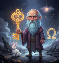 In the star-woven expanse of the Cosmic Realm, where time spirals like living geometry, there dwells Archmugus Aldus of the Gnostics — the Astrologer of the Inner Spheres and Keeper of the Golden Key. His eyes, a cascade of cerulean light, is said to shimmer with the echoes of forgotten truths. Once a mortal seeker who read the language of constellations, Aldus ascended beyond the bounds of flesh to chart the firmament of the soul. He wields the **Golden Key of the Seventh Realm**, a relic said to unlock the threshold between the finite and the eternal — where thought becomes form and truth takes light. His constant companion, a white psychic rabbit named Eidolon, perceives across dimensions, whispering visions of what lies beyond mortal reason. Aldus believes true mastery lies not in domination, but in 'Revelation' — the turning inward until the universe unveils itself within the soul. It is said that when the Archmugus finds the final glyph of the pattern, the 7th Realm shall open — and all consciousness will remember its origin.