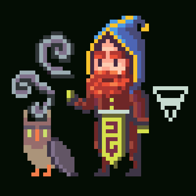 A bearded wizard with bright red hair flowing into a long, braided beard, his expression calm yet knowing; he wears a robe of deep brown trimmed in chartreuse, over which hangs a square tabard bearing runic sigils in bold crimson; a hooded mantle of blue and gold crowns his shoulders, topped by a pointed cap of matching hue; with one hand, he conjures curling tendrils of gray smoke that rise in elegant spirals; beside him stands a solemn owl with glowing yellow eyes and dusky feathers, a silent familiar steeped in wisdom and nocturnal grace. --p 24hp83o