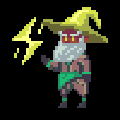 An aged wizard with dark skin tones radiates quiet power. His long white beard spills over a robe of brown and green, cinched with a verdant sash. A wide yellow hat tilts low over his eyes, glowing faintly in the same hue as the lightning bolt he conjures in one hand. The crackling energy dances in the darkness, casting sharp light across his weathered face and cloak. On his right, a cheerful female figure with white skin tone and bright blue hair and an orange headband holds a vivid rainbow that arcs like living light in their grasp. Their pink cardigan, emblazoned with a golden star, billows slightly as if caught in a breeze. At their feet, a small blue slime-like creature gazes up with a glimmer of curiosity. Together, they feel like a burst of color and joy beside the stormy gravity of the lightning mage a harmony of thunder and sunlight. --p ijh3e4b