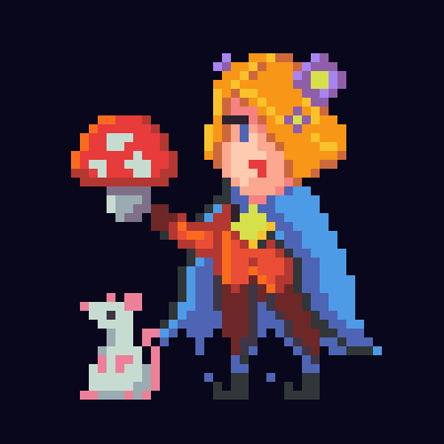 A bright-eyed figure with golden hair styled in soft waves stands poised, clutching a large red-capped mushroom speckled with white in one hand. Tiny purple flowers are tucked into their hair, glowing faintly against the warm tones of their skin. They wear a vivid orange tunic fastened by a star-shaped brooch, over which drapes a flowing blue cape that ripples down to their boots. At their feet sits a small white mouse with pink ears and tail, gazing upward as if awaiting a spell or a story. The scene radiates warmth and quiet wonder, as though they’ve just stepped out of an enchanted forest. --p ijh3e4b