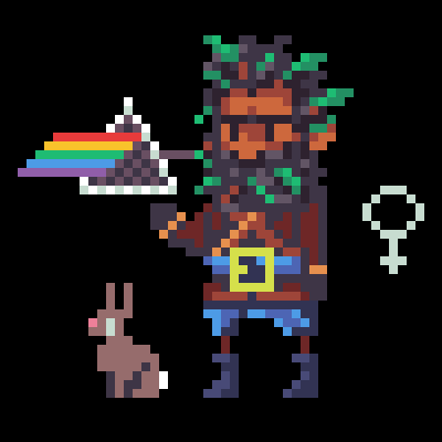 an old grizzled medium dark-skinned woodsman wizard, green leaves in his black hair, thick black beard, wilderness man, muscular, serious, wearing brown clothes, dark blue pants with belt, a beard and facial hair and dreadlocks adorned with green leaves. The figure is wearing a dark brown tunic with a lighter brown belt, a bright yellow rectangular buckle, blue shorts, and dark blue boots. He holds a prism, with a rainbow spectrum emerging from the right side. To the left of the figure, a small, brown rabbit with white patches on its chest and tail is sitting on its hind legs. with bold outlines and a slightly grainy texture, anime style, Studio Chizu, emotional realism, vibrant digital palettes, modernized studio ghibli, Makoto Shinkai-inspired anime illustration, ultra detailed, cinematic lighting, no text, 4k, hd, extreme details --ar 2:1 --raw --profile lfme4j6