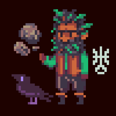 A wild druidic figure with tangled black beard and hair with twigs and branches woven in, his sharp ears jutting from beneath the living tangle; his dark skin is earthy and shadowed, marked with a primal presence; he wears a bright green tunic beneath a rustic orange vest, paired with dark trousers and boots trimmed in ochre, his garb echoing the hues of the forest; in one hand he balances two floating stones, hovering with a faint earthen glow as though bound by natural magic; at his side stands a black crow, its feathers shimmering with hints of violet, watching with sharp, intelligent eyes as his constant familiar. --p 24hp83o --v 7
