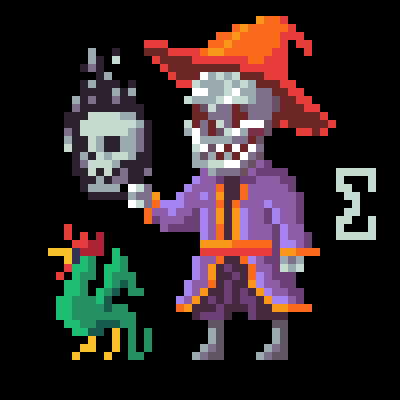 A skeletal figure stands draped in a vivid violet robe trimmed with gold, the cloth tied at the waist by a bright orange sash. Their bony face grins eternally beneath the brim of a crooked orange wizard’s hat, the sharp point bent like a flame. In one pale hand, they clutch a blackened skull wreathed in flickering dark fire, the light casting eerie reflections across their hollow eye sockets. Beside them struts a small green chicken with a red crest, its feathers gleaming faintly as if touched by strange magic. The pair exude both mischief and menace, caught between humor and the macabre. --p 4p7tobo