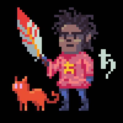 A tall figure stands with a commanding presence, their dark skin framed by a wild crown of coiled hair that seems to defy gravity. Their eyes are deep and steady, gazing forward with quiet confidence. They wear a loose crimson tunic marked with a golden sigil across the chest, its sleeves hanging comfortably over dark blue gloves. In one hand, they hold a massive orange and white feather streaked, glowing faintly like a weapon of divine craftsmanship. At their feet prowls a bright orange cat, its eyes alight with mischief, mirroring the faint flicker of magic in its master’s grip. --p 24hp83o