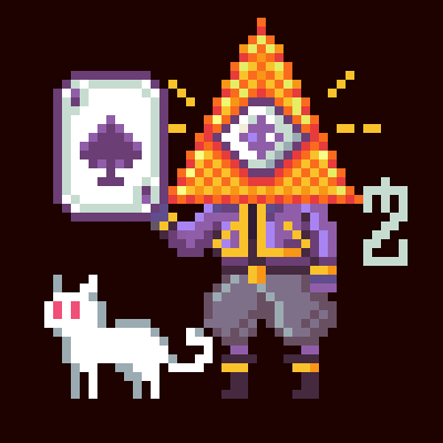 a figure with a pyramidal head and a small white cat. The main figure stands upright his head is a bright orange and yellow pyramid with a single, large, eye in the center, which appears as a dark purple iris surrounded by a lighter purple and white sclera. His head is a pyramid. Short, bright yellow lines emanate from the sides of the pyramid, suggesting a glow or aura. The figure's body is dressed in a dark purple tunic with yellow trim and details on the sleeves and collar, and baggy, light purple pants. The figure holds a playing card in its left hand.The card is mostly white with a prominent black pixelated spade symbol in the center. with bold outlines and a slightly grainy texture, anime style, Studio Chizu, emotional realism, vibrant digital palettes, modernized studio ghibli, Makoto Shinkai-inspired anime illustration, ultra detailed, cinematic lighting, no text, 4k, hd, extreme details --ar 89:52 --raw --profile lfme4j6