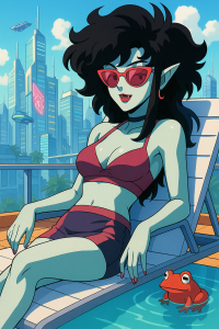 A 1990s anime-style illustration of Lucinda, a pale-skinned goth vampire girl with big dark hair, wearing rose-colored sunglasses, lounging by a rooftop pool. She looks stylish and sultry, dressed in a futuristic summer outfit. A small red frog relaxes in the pool beside her. Behind them, a bright, futuristic city skyline gleams in the sunlight, full of glass towers, neon accents, and flying cars. The mood is playful yet moody, combining goth flair with a sunny cyberpunk future.
