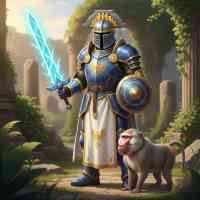 Far from the shadowed lands, under the canopy of eternal light, there reigned Numerius, a knight born of the Celestial Order. His arcane blade, Aurealis, was forged in the heart of a fallen star — radiant, pure, and bound by oath to truth. With him always was Prim, a baboon familiar said to be an ancient sage reborn. Numerius stands as the radiant bulwark against the creeping stain of otherworldly corruption.