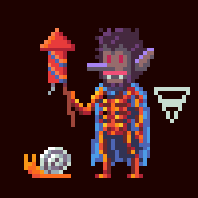 A mischievous fur-gnome figure with wild dark hair that covers it's face and sharp red eyes and two fangs. Its long nose jutting forward with an impish grin. Its chest and body is made of gold; a skeleton, layered over deep blue garments and a flowing cobalt cape; in one hand it brandishes a striped firework rocket of red and blue, held aloft like a weapon of chaotic magic; at its feet creeps a peculiar snail with a glowing orange body and a spiral silver shell, serving as a strange and whimsical familiar to its fiery master. --v 7 --p 4p7tobo