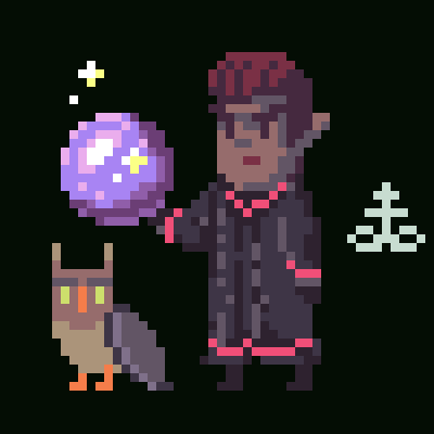 Close up, profile, A dignified sorcerer stands draped in midnight robes lined with crimson trim, his posture composed and deliberate. His dark skin glows softly in the light cast by the shimmering orb he holds aloft a sphere of violet energy swirling with flecks of gold and silver, as though the night sky itself had been trapped within his grasp. His expression is calm and unreadable, the bearing of someone who has long since mastered both patience and power. His hair, dapper and slicked back redish hair, gives him the appearance of one touched by infernal knowledge or celestial fire. At his side perches a solemn owl, its amber eyes unblinking and wise. The bird’s feathers seem to absorb the darkness around it, echoing its master’s quiet authority. Together, the pair exude an aura of nocturnal strength watchers of the unseen, keepers of secrets whispered under starlight. --p 3zcoy9p
