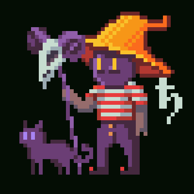 A mischievous spellcaster with midnight-purple skin and glowing amber eyes stands confidently beneath a wide, crooked orange hat that droops at the tip like a candle’s flame. His striped red-and-white shirt gives him a playful, almost pirate-like air, contrasting with the eerie ram skull staff clutched in one hand its hollow eyes and curling horns radiate quiet menace. Beside him prowls a shadowy cat, fur dark as ink and eyes glinting violet, its form half-solid, half-smoke. The figure’s smile hints at secrets whispered between mischief and magic a wanderer of charm and danger. --p ijh3e4b