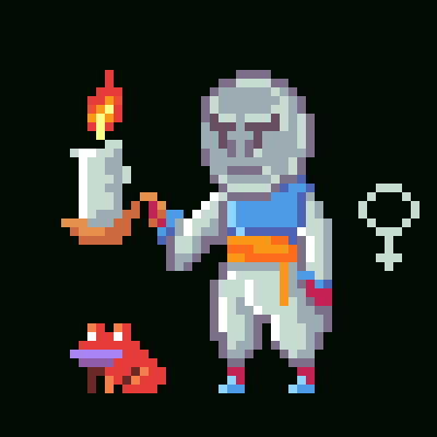 A mysterious figure with a smooth round egg like face, silver face stands in calm stillness, its expression unreadable and cold. The body is dressed in pale garments of white and light blue, cinched at the waist with a bright orange sash that adds a vivid splash of color. The figure holds a lit candle in a candle holder in one hand, the flickering flame casting warm light against the reflective surface of its face. At its feet sits a small crimson frog, its body low to the ground and eyes wide, as if captivated by the dancing glow above. --p ijh3e4b