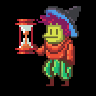 Chronomancer Peppy of the Obelisk is a whimsical frog mage, his bright green skin standing out against the rich colors of his attire. A wide-brimmed wizard’s hat, dark with a vivid blue trim, perches jauntily atop a head crowned with wild tufts of magenta hair. His face is simple yet expressive, with square eyes and a serene smile that hints at a calm wisdom. He wears a flowing red-orange cloak draped over his shoulders, its folds enveloping him in warmth, while below, his green-and-teal striped trousers puff out like the garb of a court jester, adding a playful flair to his magical presence. In his hand, he carries a tall red hourglass filled with trickling sand, glowing faintly with the suggestion of enchanted timekeeping. Both curious and timeless, this frog mage seems less like a warrior and more like a sage who measures destinies, guiding others with patience and the quiet tick of passing moments. --no text --ar 3:4 --style raw --v 7 --p k1z41yf